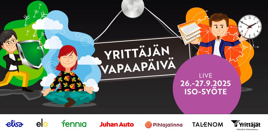 Yrittäjän vapaapäivä 2025 toteutuksessa mukana: Pohjois-Pohjanmaan Yrittäjät, Elisa Oyj, Elo, Fennia, Juhan Auto, Pihlajalinna ja Talenom.