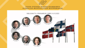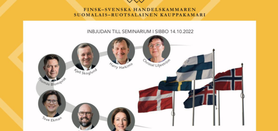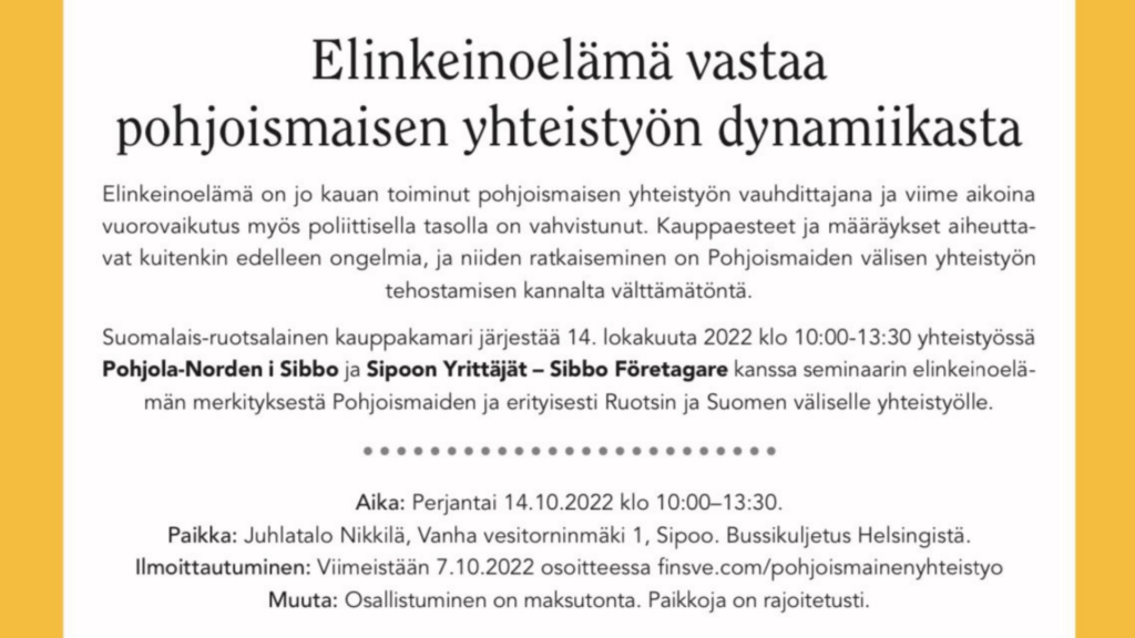 Suomalais-ruotsalainen kauppakamari järjestää 14. lokakuuta 2022 klo 10.00-13.30 yhteistyössä Pohjola-Norden Sibbo Sipoo ja Sipoon Yrittäjät – Sibbo Företagare kanssa seminaarin elinkeinoelämän merkityksestä Pohjoismaiden ja erityisesti Ruotsin ja Suomen väliselle yhteistyölle