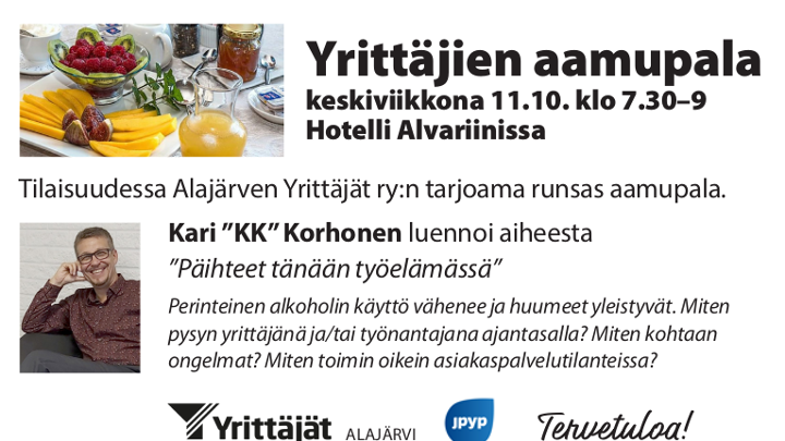 Tilaisuudessa Alajärven Yrittäjät ry:n ja JPYP:n tarjoama runsas aamupala Hotelli-Ravintola Alvariinissa. Tilaisuus alkaa 7.30 aamiaisella.