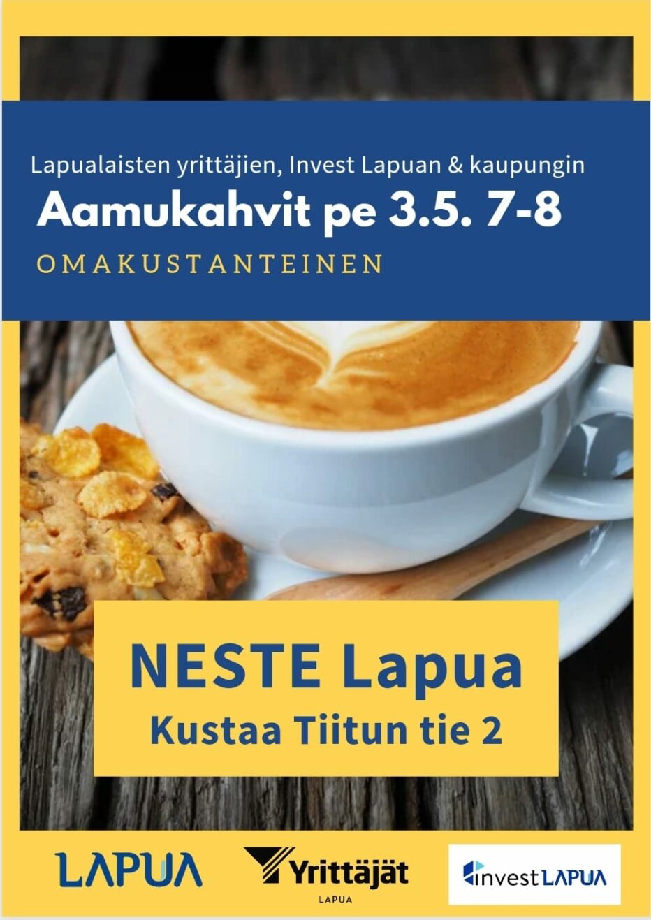 Yrittäjien aamukahvit 3.5.2024 klo 07:00 – 08:00 Lapuan Yrittäjät Yrittäjien aamukahvit Neste Lapualla pe 3.5. klo 7-8. { "name":"Yrittäjien aamukahvit", "description":"", "startDate":"2024-05-03", "startTime":"07:00", "endDate":"2024-05-03", "endTime":"08:00", "location":"Kustaa Tiitun tie 2", "label":"Lisää kalenteriin", "options":[ "Apple", "Google", "iCal", "Microsoft365", "MicrosoftTeams", "Outlook.com", "Yahoo" ], "inline":true, "listStyle":"modal", "trigger":"click", "timeZone":"Europe/Helsinki", "iCalFileName":"Yrittajat.fi - Yrittäjien aamukahvit" } Omakustanteinen kaikille osallistujille Kustaa Tiitun tie 2 Verkostoituminen Jaa Kopioitu leikepöydälle