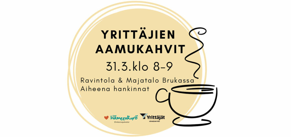 Yrittäjien aamukahvit Hämeenkyrössä 31.3.2023 klo 08:00 – 09:00 Hämeenkyrön Yrittäjät Tervetuloa aamukahville verkostoitumaan ja kuulemaan Ulla Tirrosen neuvoja julkisista hankinnoista. { "name":"Yrittäjien aamukahvit Hämeenkyrössä", "description":"", "startDate":"2023-03-31", "startTime":"08:00", "endDate":"2023-03-31", "endTime":"09:00", "location":"RavintolaampMajatalo Bruka Kyrspohjantie 359 ", "label":"Lisää kalenteriin", "options":[ "Apple", "Google", "iCal", "Microsoft365", "MicrosoftTeams", "Outlook.com", "Yahoo" ], "inline":true, "listStyle":"modal", "trigger":"click", "timeZone":"Europe/Helsinki", "iCalFileName":"Yrittajat.fi - Yrittäjien aamukahvit Hämeenkyrössä" } Maksuton Ravintola&Majatalo Bruka, Kyröspohjantie 359 Julkiset hankinnat Verkostoituminen Jaa Kopioitu leikepöydälle