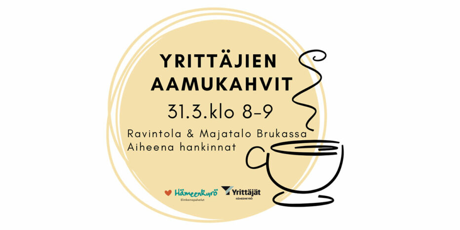 Yrittäjien aamukahvit Hämeenkyrössä Tämä teksti on konekäännetty. 31.3.2023 klo 08:00 – 09:00 Hämeenkyrön Yrittäjät Tervetuloa aamukahville verkostoitumaan ja kuulemaan Ulla Tirrosen neuvoja julkisista hankinnoista. { "name":"Yrittäjien aamukahvit Hämeenkyrössä", "description":"", "startDate":"2023-03-31", "startTime":"08:00", "endDate":"2023-03-31", "endTime":"09:00", "location":"RavintolaampMajatalo Bruka Kyrspohjantie 359 ", "label":"Lisää kalenteriin", "options":[ "Apple", "Google", "iCal", "Microsoft365", "MicrosoftTeams", "Outlook.com", "Yahoo" ], "inline":true, "listStyle":"modal", "trigger":"click", "timeZone":"Europe/Helsinki", "iCalFileName":"Yrittajat.fi - Yrittäjien aamukahvit Hämeenkyrössä" } Maksuton Ravintola&Majatalo Bruka, Kyröspohjantie 359 Julkiset hankinnat Verkostoituminen Jaa Kopioitu leikepöydälle