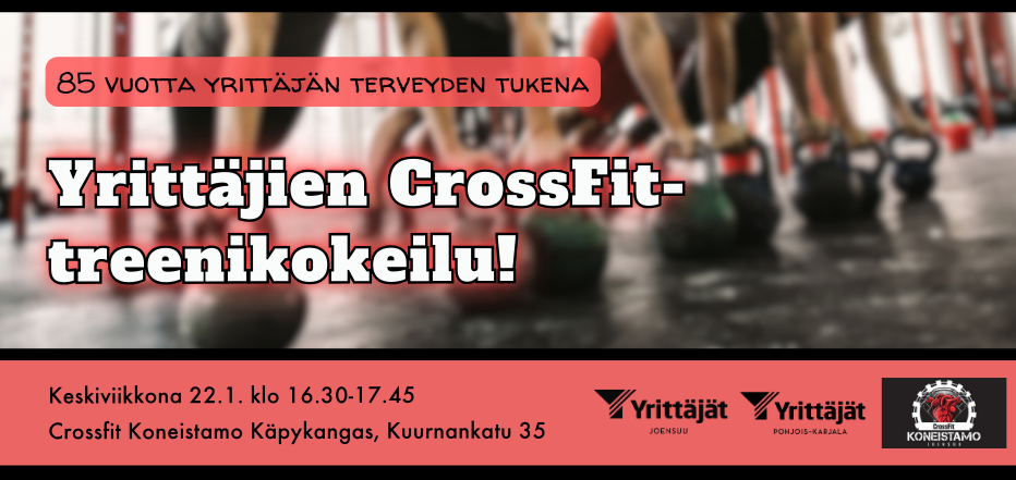Oletko miettinyt, mitä CrossFit oikeasti on? Tule kokeilemaan itse! Joensuun Yrittäjät, Pohjois-Karjalan Yrittäjät ja CrossFit Koneistamo kutsuvat sinut matalan kynnyksen treenikokeiluun, jossa pääset tutustumaan lajiin ammattilaisten opastamana. Olitpa sitten vasta-alkaja tai kokenut kuntoilija, tämä tapahtuma sopii kaikille!