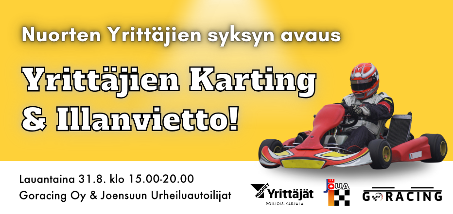 Pohjois-Karjalan Nuoret Yrittäjät kutsuvat sinut mukaan syksyn avajaistapahtumaan, Yrittäjien Karting-lajikokeiluun, jossa luvassa vauhdikasta menoa, maukasta ruokaa ja rentoa yhdessäoloa!