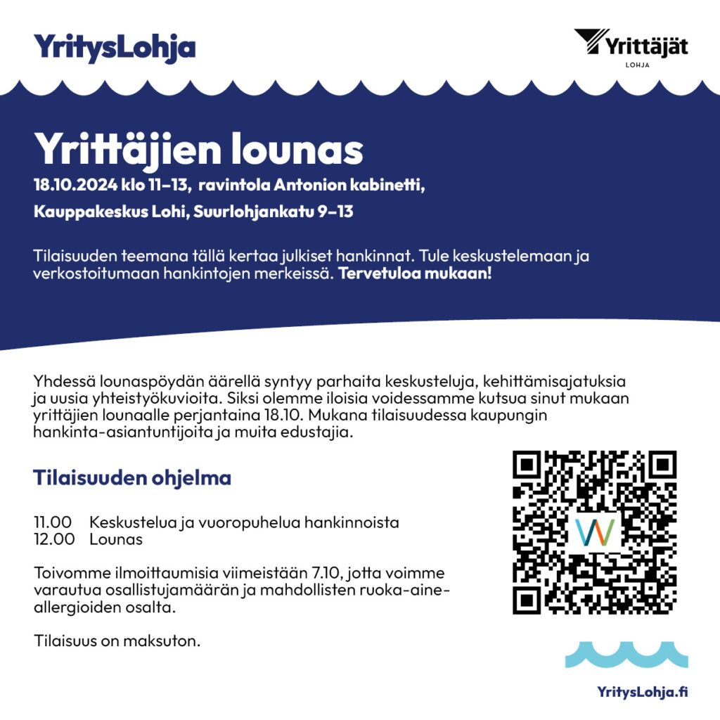 Lounas Yrittäjien lounas 18.10. klo 11 – 13 18.10.2024 klo 11:00 – 13:00 Lohja Lohjan Yrittäjät ILMOITTAUDU TÄSTÄ { "name":"Yrittäjien lounas 18.10. klo 11 – 13", "description":"", "startDate":"2024-10-18", "startTime":"11:00", "endDate":"2024-10-18", "endTime":"13:00", "location":"Ravintola Antonion kabinetti Kauppakeskus Lohi Suurlohjankatu 913", "label":"Lisää kalenteriin", "options":[ "Apple", "Google", "iCal", "Microsoft365", "MicrosoftTeams", "Outlook.com", "Yahoo" ], "inline":true, "listStyle":"modal", "trigger":"click", "timeZone":"Europe/Helsinki", "iCalFileName":"Yrittajat.fi - Yrittäjien lounas 18.10. klo 11 – 13" } Maksuton Ravintola Antonion kabinetti, Kauppakeskus Lohi, Suurlohjankatu 9-13, Lohja Jaa Kopioitu leikepöydälle