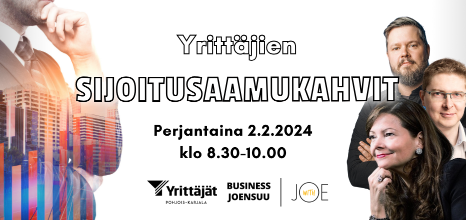 Tarjolla kahvia, teetä ja pientä purtavaa suolaisen sekä makean muodossa. Tarjoilujen vuoksi ilmoittaudu ennakkoon 26.1.2024 mennessä. Tilaisuuden järjestävät yhteistyössä Business Joensuu Oy ja Pohjois-Karjalan Yrittäjät. Tapahtuma on maksuton.