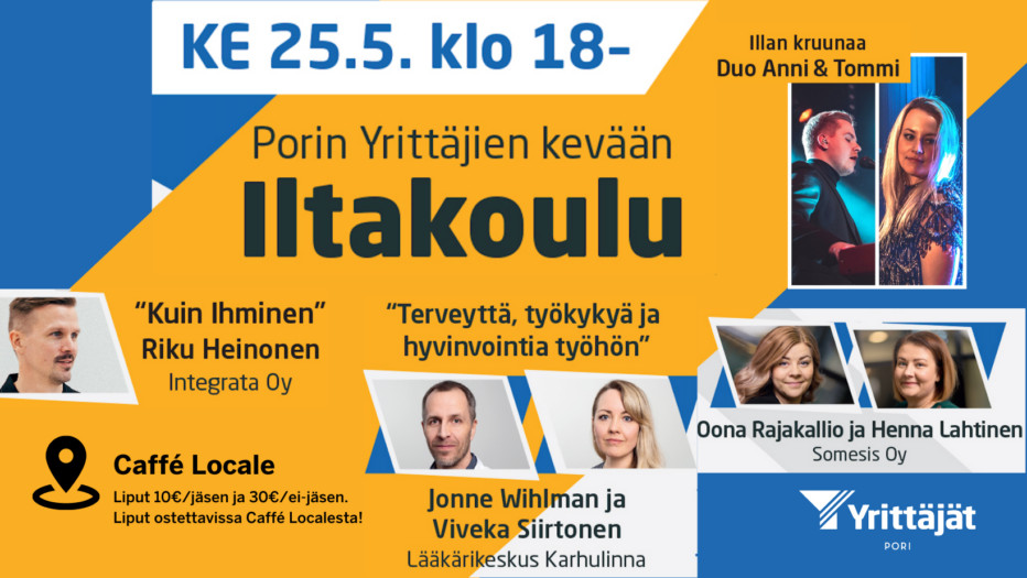 Lippu tapahtumaan maksaa Porin Yrittäjät ry:n jäsenille 10€ ja ei-jäsenille 30€. Liput saat ostettua suoraan Caffe Localesta, osoitteesta Yrjönkatu 12, 28100 Pori.
