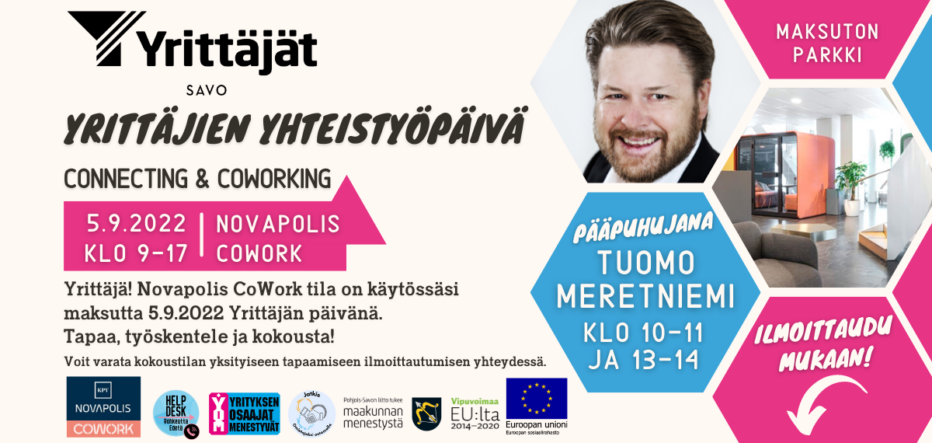 Savon Yrittäjät ja KPY Novapolis CoWork järjestävät Yrittäjän päivän kunniaksi maanantaina 5.9. klo 9-17 Yrittäjien YhteisTyöpäivän.
