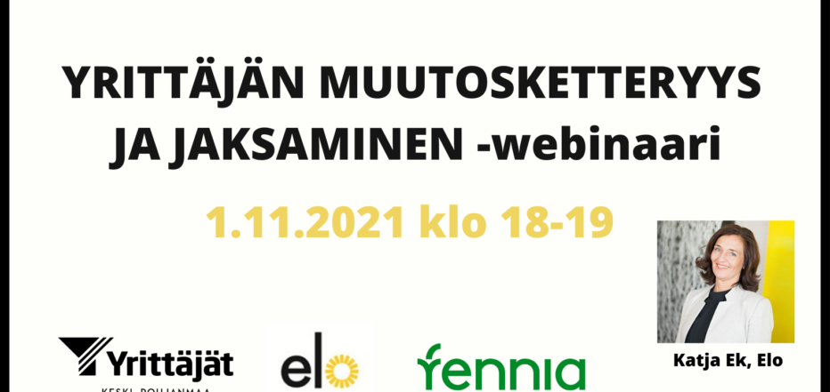 Järjestämme yhteistyössä Elon ja Fennian kanssa webinaarin, jossa aiheena Yrittäjän muutosketteryys ja jaksaminen.
