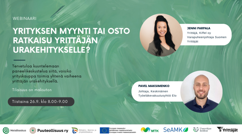 Tervetuloa kuuntelemaan paneelikeskustelua siitä, voisiko yrityskauppa toimia yhtenä vaiheena yrittäjän urakehityksellä. Paneelin keskeisinä teemoina ovat yrittäjän urakehitys, hyvinvointi ja jaksaminen sekä varautuminen tulevaisuuden haasteisiin, kuten työkyvyn alentumiseen tai innostuksen loppumiseen.