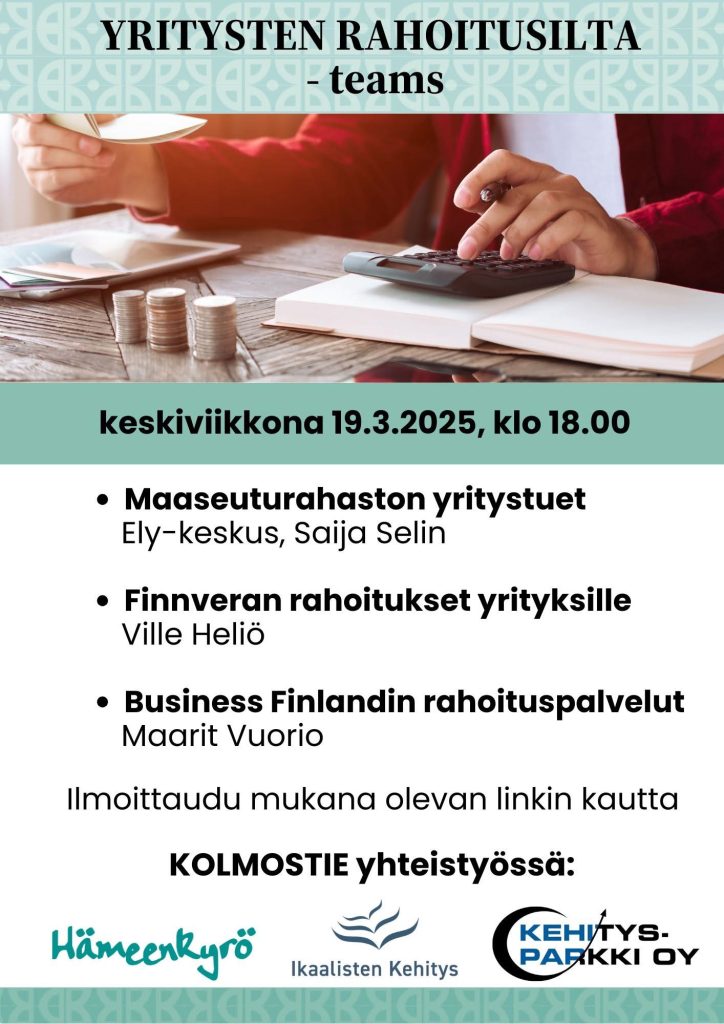 Tervetuloa maksuttomaan Yritysten Rahoitusiltaan, joka järjestetään Teamsissa! Tapahtumassa kuulet asiantuntijoilta eri rahoitusmahdollisuuksista yrityksille.