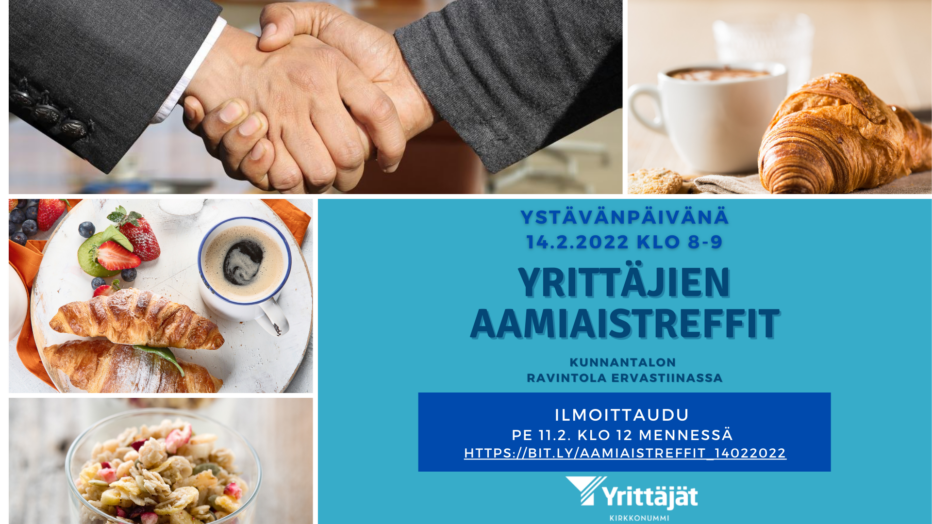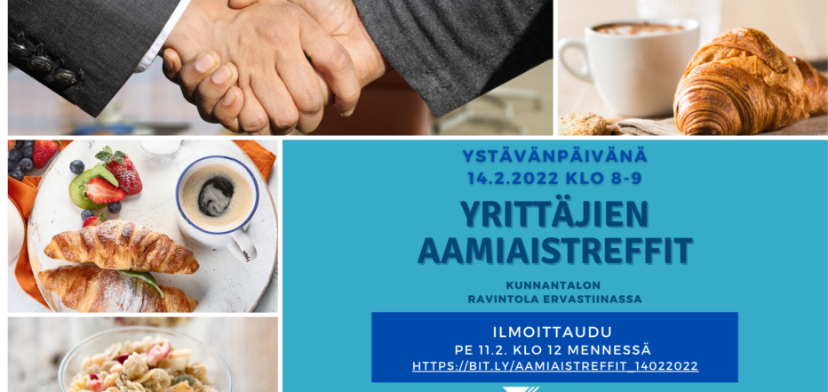 Tarjoamme kaikille yrittäjille – jäsenyyksistä riippumatta – aamiaistreffit ma 14.2. klo 8 alkaen kunnantalon ravintola Ervastiinaan.