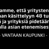 Kasvupalvelujohtaja Jaakko Niinistön Vantaan 46. Elinkeinopäivässä kertoma kaupungin lupaus kuuluu: ”Lupaamme, että yritysten asiat otetaan käsittelyyn 48 tunnin sisällä ja yrityksiä…