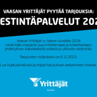 Vaasan Yrittäjät ry. hakee vuodelle 2024 viestintäkumppania suunnittelemaan ja toteuttamaan yhdistyksen sisäistä ja ulkoista viestintää. Ostettava palvelu käsittää monikanavaisen, pääosin…
