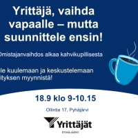 Tervetuloa aamukahville, jossa käyn läpi omistajanvaihdoksen prosessia ja annan vinkkejä valmistautumiseen – vaikka myynti ei olisikaan ajankohtainen! Tilaisuus on matalan…