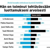 Pekka Haavisto on ykkössuosikki pääministeriksi, Petteri Orpo kakkonen, Antti Rinne kolmas ja Juha Sipilä neljäs.
