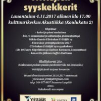 YLIVIESKAN YRITTÄJÄT JÄRJESTÄVÄT SYYSKEKKERIT AKUSTIIKASSA 4.11.2017. Ohjelmassa mm. Tuure Kilpeläinen ja Kaihonkaravaani, buffet Illallinen, hauskaa yhdessä oloa, puheenvuoroja, syyskokouksen asiat…