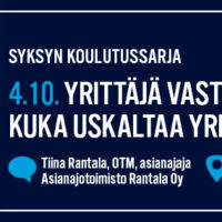 Lahden Yrittäjien syksyn koulutussarjan ensimmäisessä osassa asianajaja Tiina Rantala kertoo yrittäjän vastuusta. Koulutus järjestetään yhteistyössä Hämeen Hallituspartnerit ry kanssa. Tarjolla…