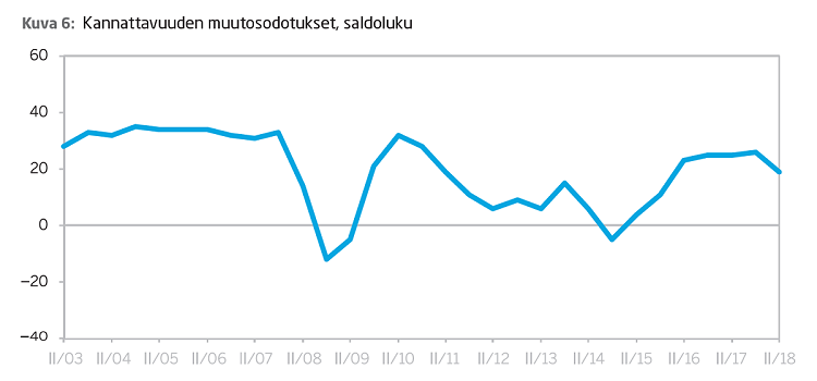 Myös pk-yritysten odotukset liikevaihdon kehityksen sekä kannattavuuden suhteen laskivat verrattuna edelliseen barometriin. Liikevaihdon kehitysodotukset ovat silti edelleen selvästi positiiviset ja edelleen pk-yrityksissä kannattavuuden odotetaan paranevan.