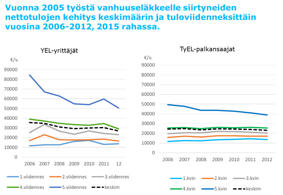 Samalla Eläketurvakeskuksen selvityksen mukaan yrittäjien toimeentulo vanhuuseläkeiässä ei ole palkansaajaan verrattuna huono. Yrittäjien tulotaso näyttää sekä keskimäärin että eri tuloviidenneksissä olevan parempi kuin työntekijällä sekä heti eläkkeelle jäädessä että vielä vuosien eläkkeelläolon jälkeen.
