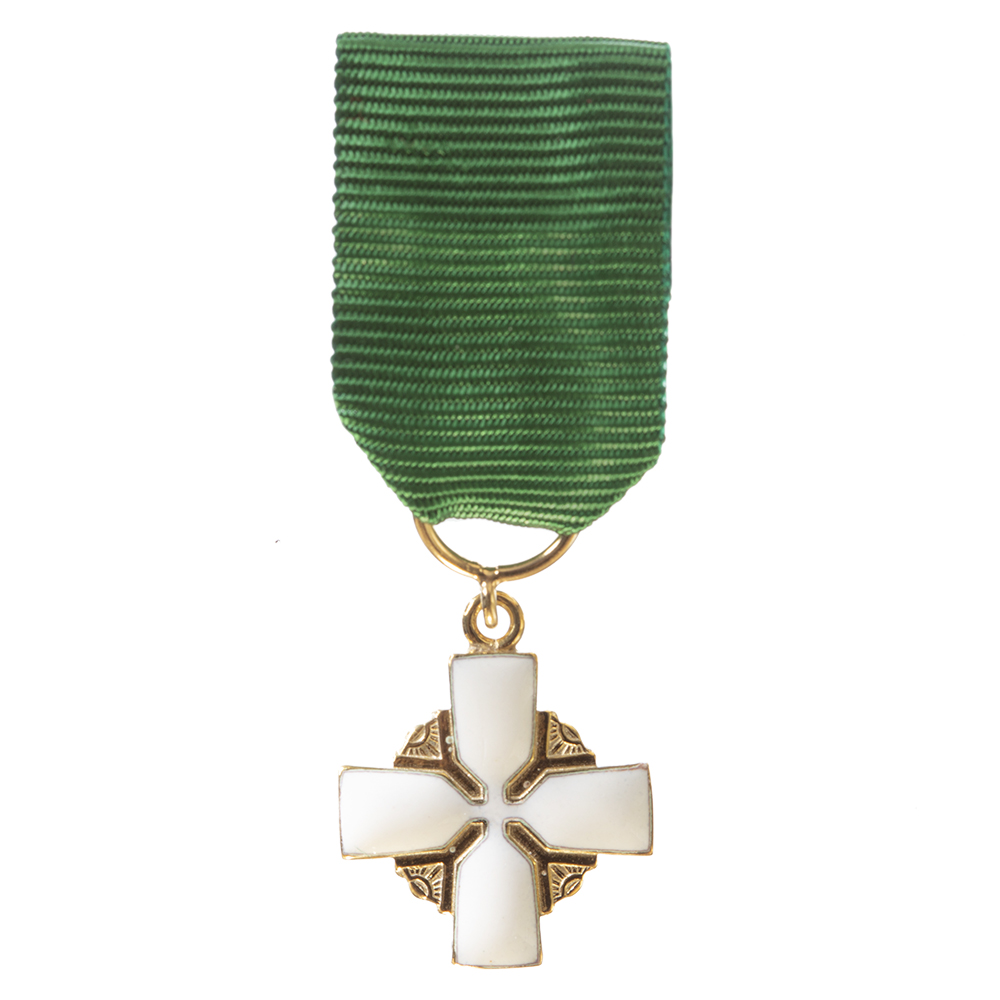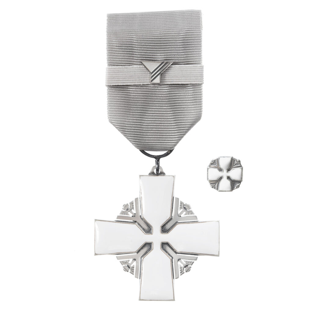 Ristin materiaali on hopea. Sakarat on emaloitu ja merkki on patinoitu tummaksi.