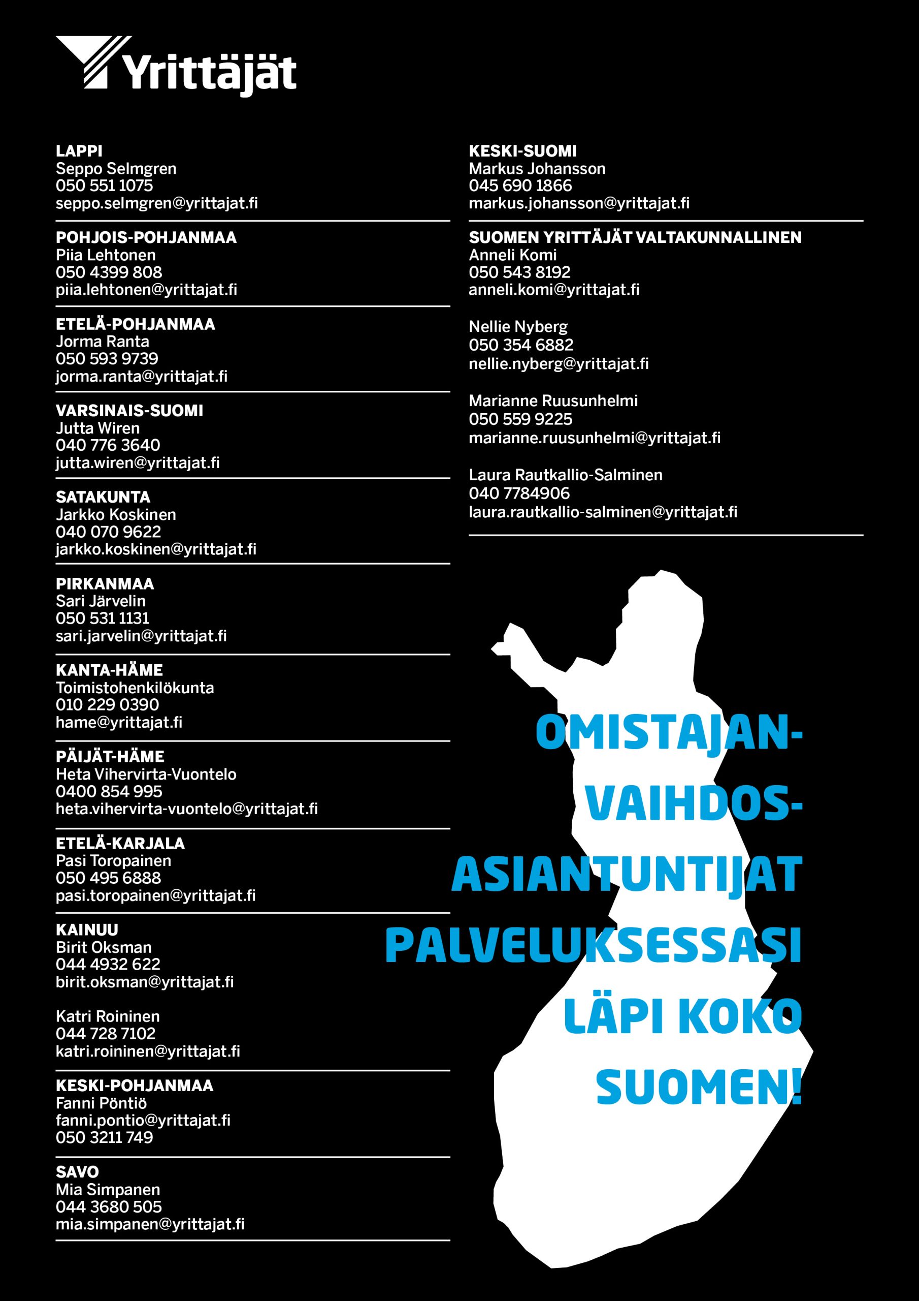 Yrittäjien jäsenenä saat myös neuvontaa omistajanvaihdoksiin asiantuntijoiltamme ympäri Suomen. Katso oman alueesi asiantuntijan yhteystiedot alla tai lataa yhteystiedot täältä.