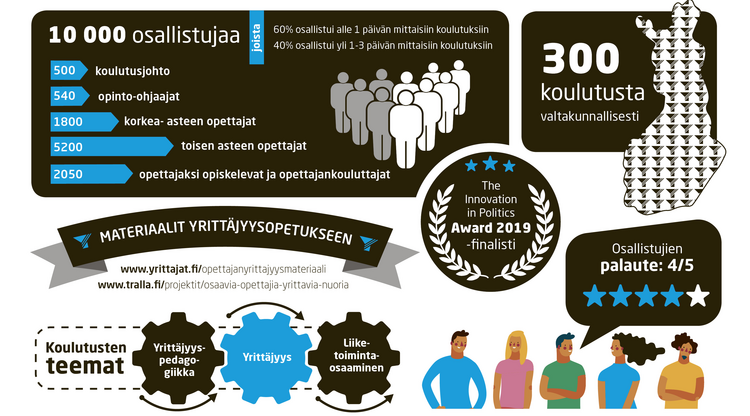 – Yhtenä tavoitteena oli, että koulutus vahvistaa yrittäjyystoiminnan juurtumista oppilaitoksiin. Huomasimme, että aika monessa oppilaitoksessa saatiin joukkovoimaa yrittäjyyskasvatukseen, yrittäjyyskasvatus jollain tavalla arkipäiväistyi, ja yhä useampi opettaja innostui siitä.