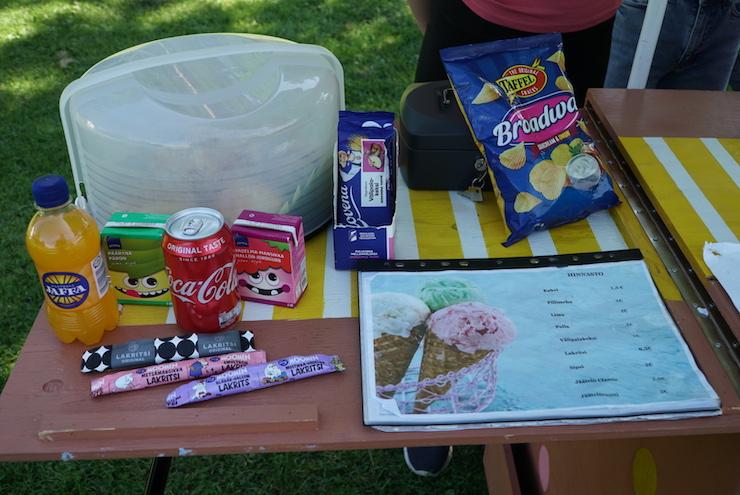 Pullien lisäksi Ylivainion myyntikärrystä löytyy pillimehua, limsaa, kahvia, lakritsipatukoita ja välipalakeksejä.