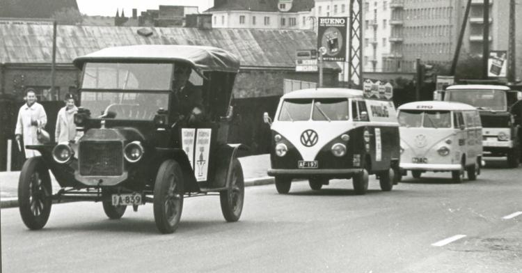 Kuvassa: Kuvassa yksi yrittäjäjärjestön näkyvyystempauksista, Y-viikon avajaisten mainoskulkueen autoja vuonna 1967.