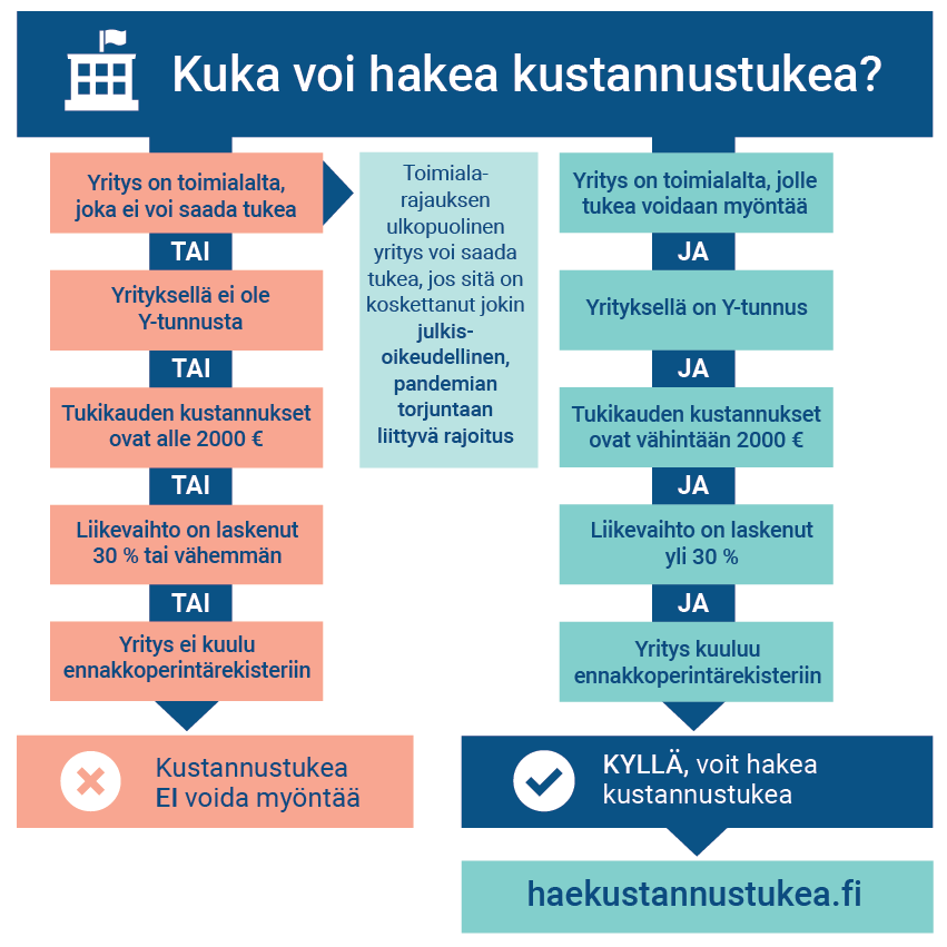 Käsittelyn nopeuttamiseksi Valtiokonttori kehottaakin yrityksiä tarkistamaan tuen piiriin kuuluvat toimialat sekä muut ehdot Valtiokonttorin kotisivuilta haekustannustukea.fi.
