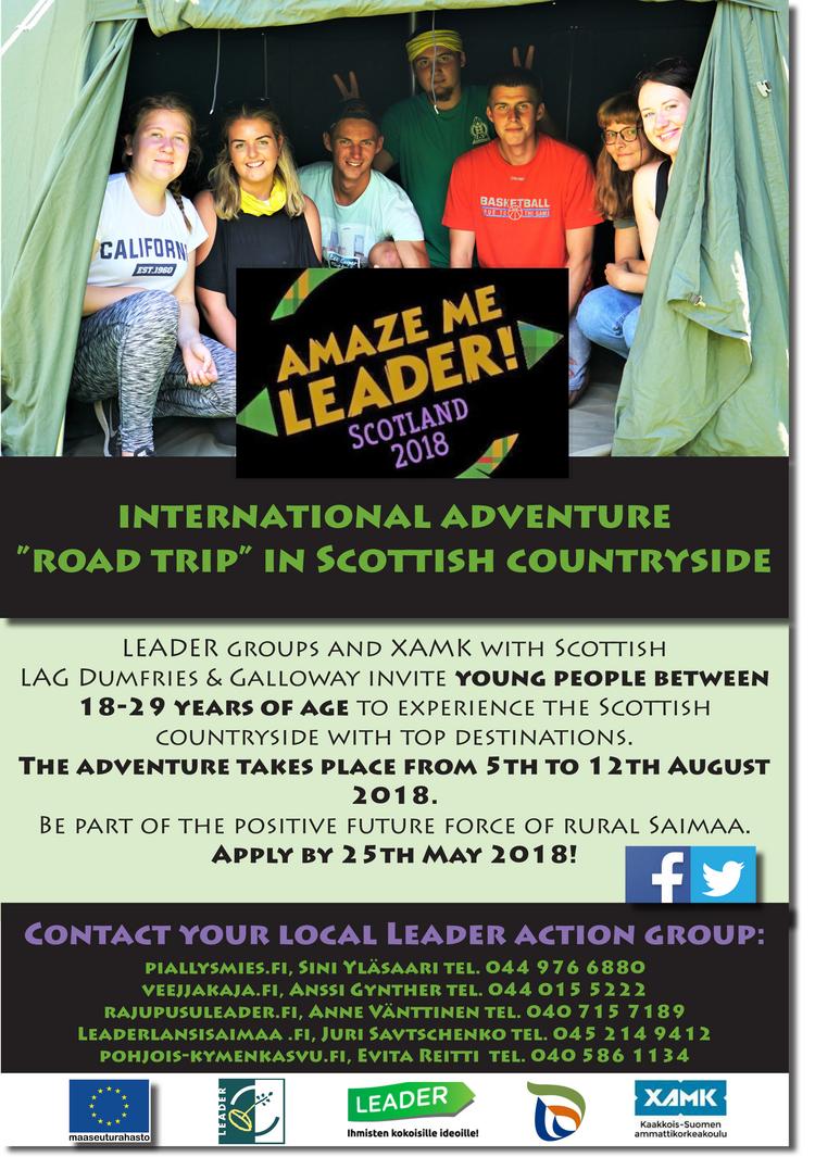 Skotlantilainen Leader-yhdistys Dumfries & Galloway järjestää Amaze Me Leader -seikkailuleirin omalla alueellaan elokuussa, 5.-12.5.2018. Vastaava tapahtuma järjestettiin viime vuonna Saimaan ympäriajona, ja samalla vierailtiin myös Savonlinnan seudulla. Nyt järjestämme nuorille mahdollisuuden tutustua Leader-rahoitettuihin maaseutukohteisiin Skotlannissa ja haemme viiden Leader-yhdistyksen alueelta kahtakymmentä 18-29 -vuotiaita nuorta aikuista osallistujiksi tapahtumaan.
