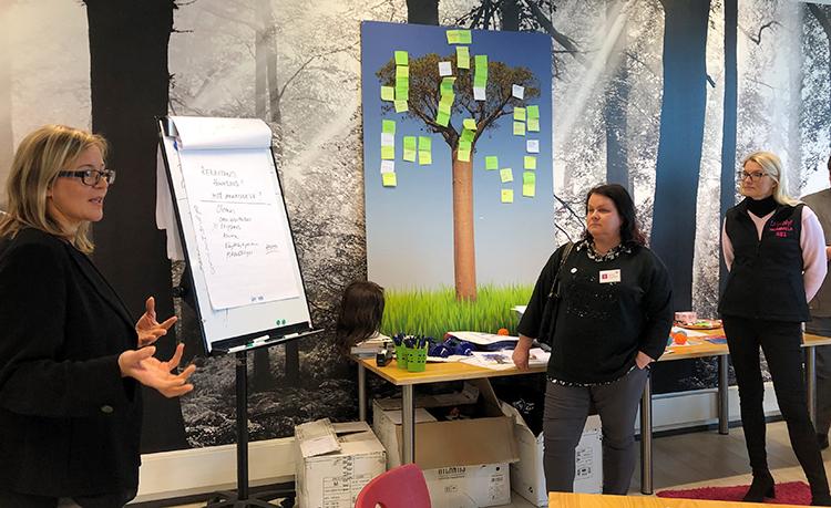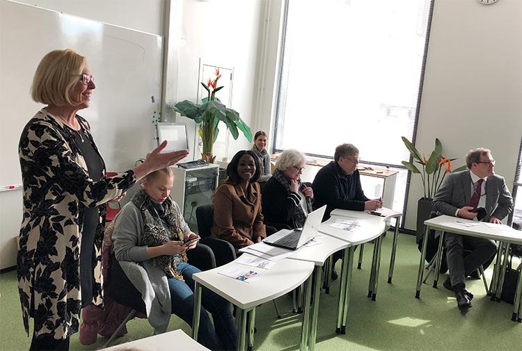 Kansanedustaja, ehdokas Johanna Karimäki (vihr.) kuunteli tyytyväisenä esittelyä yrittäjyyskasvatuksesta.