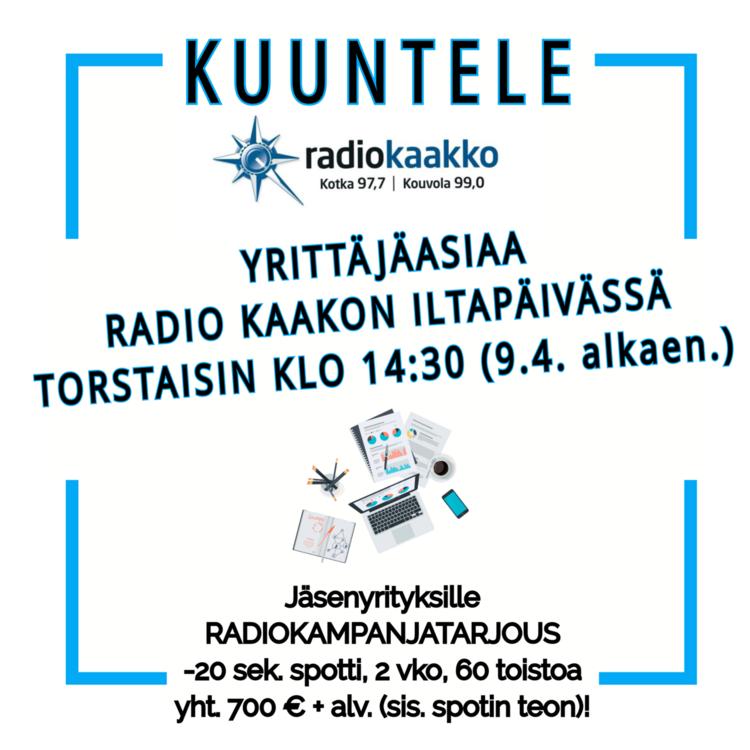 Radio Kaakon taajuudella ajankohtaista asiaa yrittäjyydestä ja yrityksistä. Käännä radiosi oikealle taajuudelle torstaisin kello 14.30.