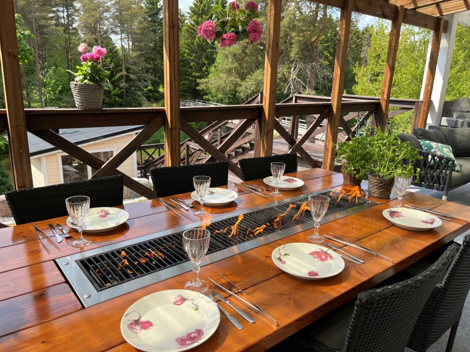 Terassipöytään integroitu grilli juontaa juurensa illanvietosta Saarisen kotona.