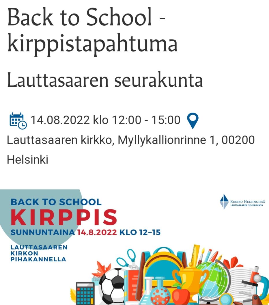 Lauttasaaren seurakunta järjestää Back to School- kirppistapahtumaan sunnuntaina 14.8.2022 klo 12−15. Tule tekemään löytöjä ja kierrättämään muun tavaran ohella erityisesti lasten ja koululaisten vaatteita ja harrastusvälineitä. Tapahtumassa esitellään paikallisia palveluita, tuotteita ja menovinkkejä kerholaisten ja koululaisten vanhemmille.