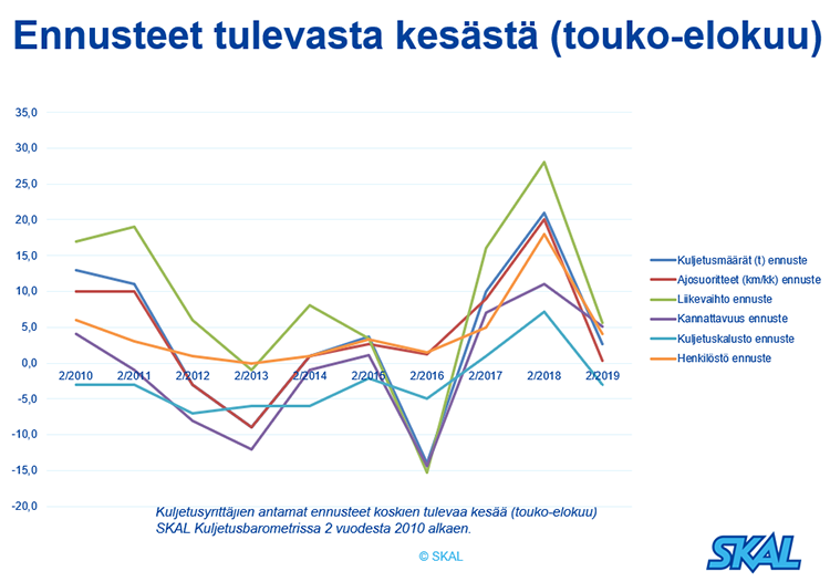 SKAL ry:n vuoden 2019 toiseen kuljetusbarometriin vastasi yhteensä 535 jäsenyritystä. Vastaajat edustavat kaikkia SKAL ry:n erikoisjärjestöjä ja toimialoja. SKAL Kuljetusbarometri toteutetaan kolme kertaa vuodessa ja se lähetetään noin 4 400 jäsenyrittäjälle. Kysely toteutettiin 13.–27.toukokuuta.
