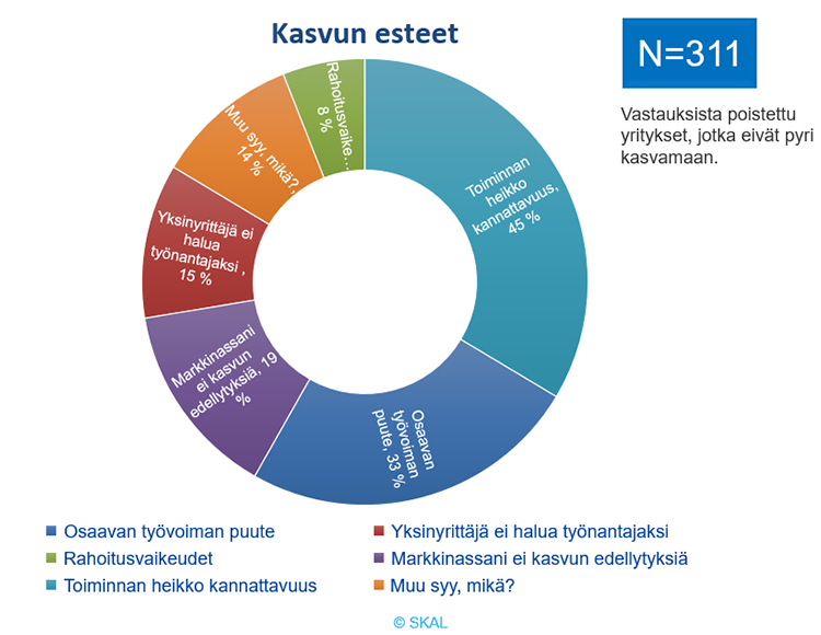 Yrittäjät kokevat merkittävimmäksi kasvun esteeksi kannattavuusvaikeudet. Seuraavaksi merkittävin kasvun este on pula osaavasta työvoimasta.