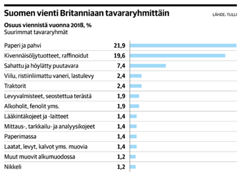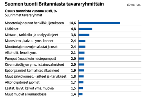 Alla kuvat Suomen viennistä Britanniaan ja tuonnista Britanniasta tavararyhmittäin. Lähde: Tulli