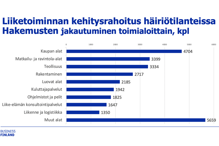 Häiriötilannerahoitusta hakeneet yritykset jakautuvat laajasti eri toimialoille. Eniten, 16 prosenttia, hakemuksia jättivät kaupan alan yritykset, ravintola- ja matkailualan yrityksiä oli 12 prosenttia sekä teollisuusyrityksien hakemuksia 11 prosenttia.