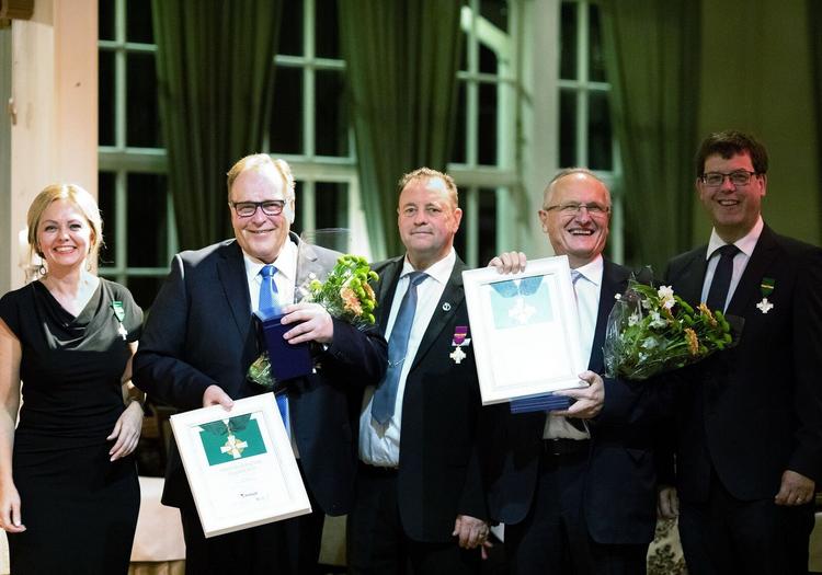 Caj-Erik Karp ja Pentti Risberg vastaanottavat Suurristit Yrittäjäjuhlassa Strampen ravintolassa 10.11.2018. Kuvassa Caj-Erikin ja Pentin lisäksi Rannikko-Pohjanmaan Yrittäjien puheenjohtajisto eli puheenjohtaja Mikael Fredman ja varapuheenjohtajat Katja Rajala ja Kaj Svels.