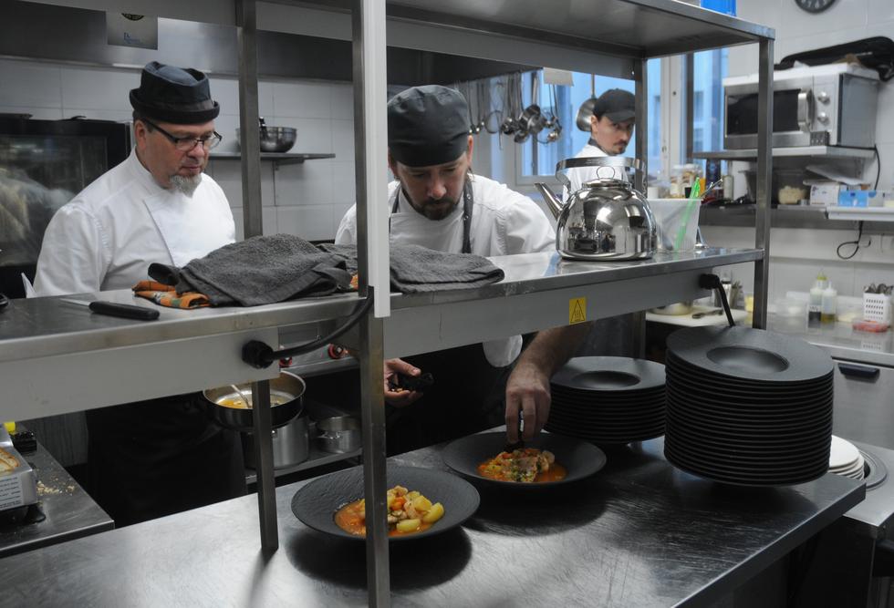 – Lounaspuoli taas oli tullut hyvin tutuksi aiemmassa työpaikassa Valkeakoskella, he kertovat. Ravintola pyörii kuuden hengen miehityksellä. Keittiössä ahertavan trion lisäksi myös sali työllistää kolme tekijää. Vakituiset aukioloajat rajoittuvat tätä nykyä lounasaikaan. Sen osalta tarjoilu alkaa kello 10.30 ja lounaslista on tilattavissa kello 14 saakka joka arkipäivä. Muun ajan tilat ovat tilausravintolakäytössä.