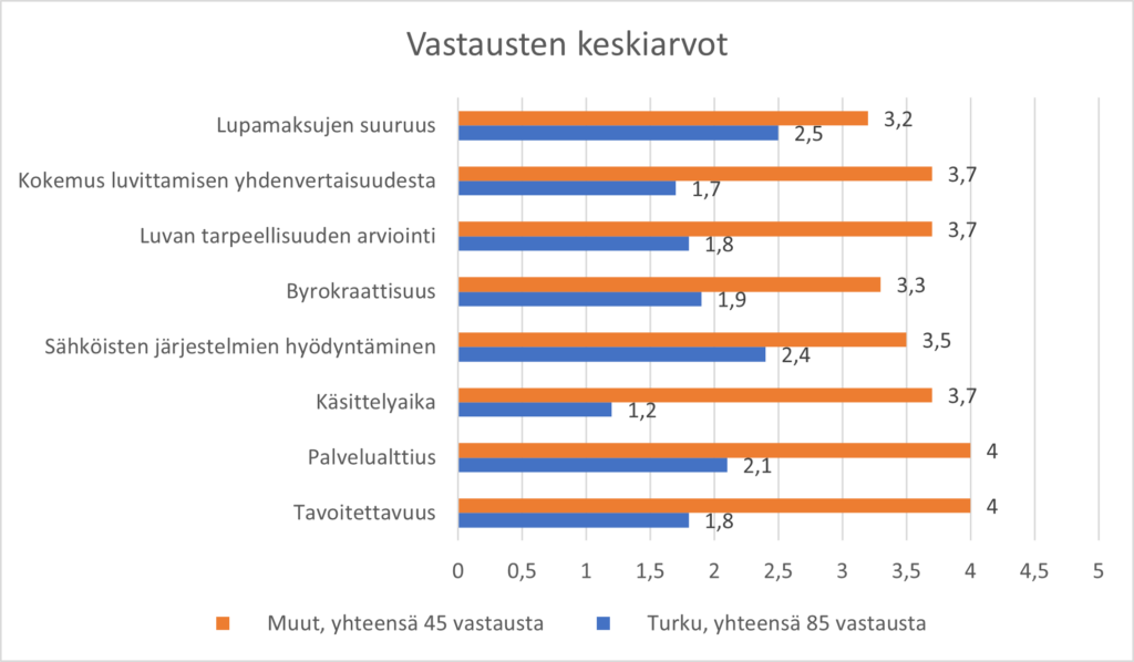 Käsittelyajan osalta Turun saama arvosana oli erityisen paljon heikompi kuin ympäristökuntien. Tähän ollaan hakemassa ja kannattaa hakea pikaisia ja moninaisia ratkaisuja.