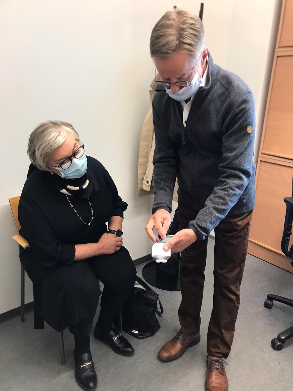 ![]() Hallituksen puheenjohtaja Tapani Lahtinen esittelee mittauslaitetta Vehviläiselle. |