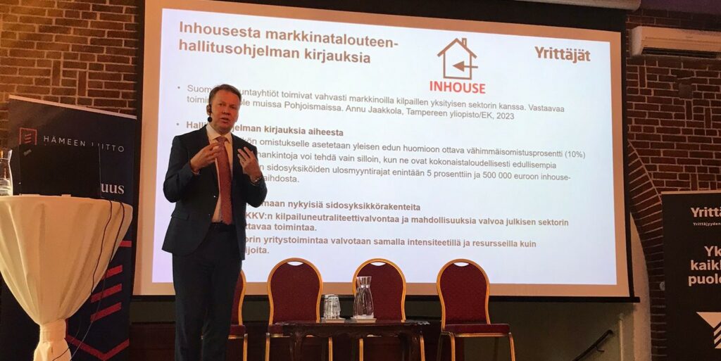 Johtaja Harri Jaskari (Suomen Yrittäjät) totesi, että Suomessa on noin 15 miljardin euron markkina, joka on käytännössä suljettu yksityisiltä yrityksiltä. Sillä operoivat kuntayhtiöt, joista osa kasvaa nyt vauhdilla. Samalla ne ovat tehneet kilpailutuksen välttämisestä myyntivaltin. Tämä ei ole veronmaksajien, julkisen talouden eikä elinvoiman lisäämisen näkökulmista järkevää.