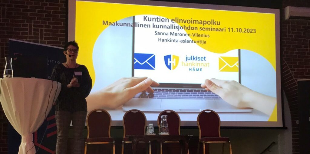 Hankinta-asiantuntija Sanna Meronen-Vilenius esitteli kunnille ja hankintayksiköille tehtyä elinvoimatyökalua. Kahden kuluneen vuoden aikana kuntia on myös koulutettu hankintojen johtamiseen, viestintään itse hankinnan valmisteluun. Käydyssä keskustelussa nousi esiin tarve poikkihallinnollisen (kokonaisvaltaisen) ajattelun lisääntymiseen hankintoja tehdessä sekä ennakoivan markkinavuoropuhelun tarve ja merkitys. Esitys pisti Riihimäen Yrittäjien varapuheenjohtajan Erja Eiron kysymään: ”Miksi julkisten hankintojen tulee olla niin vaikeita, että niihin osallistumista joutuu yrittäjille kouluttajaan ja neuvomaan”.