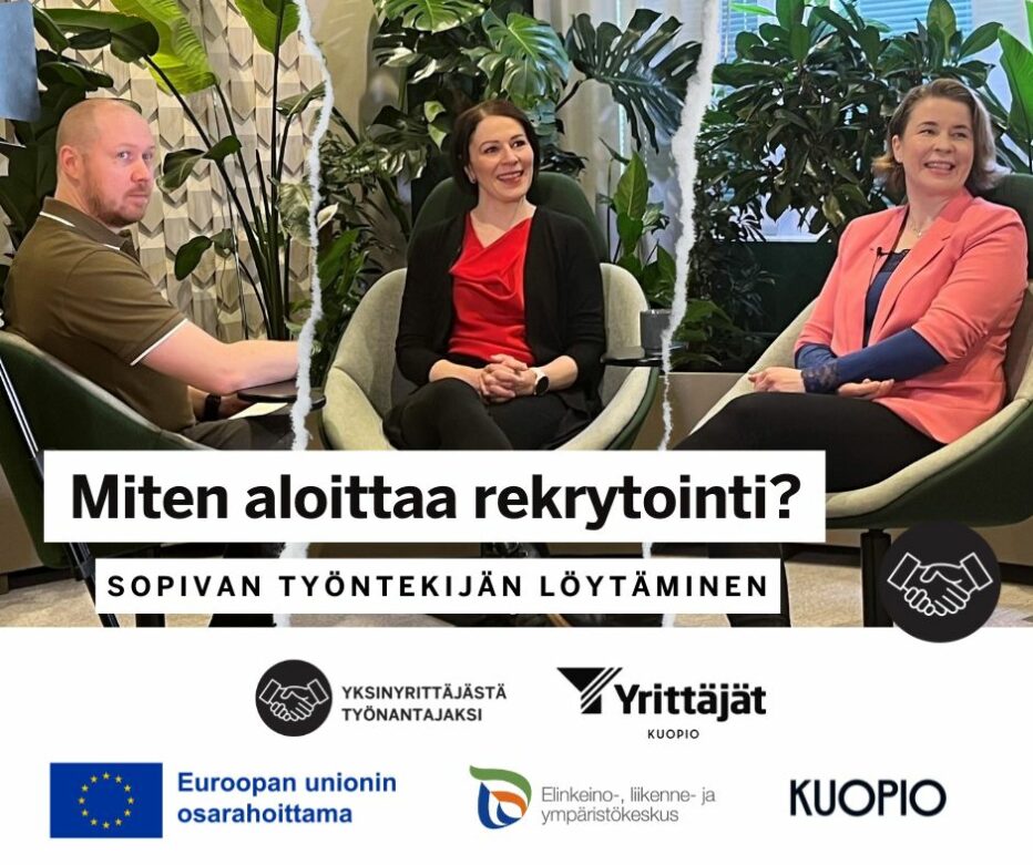 Kuopion Yrittäjien YouTube-kanavalla on nyt nähtävillä ensimmäinen osa Yksinyrittäjästä työnantajaksi -hankkeen tuottamasta työllistämisen infovideoiden sarjasta. Videoiden tavoitteena on tukea ja helpottaa yksinyrittäjiä heidän rekrytointiprosesseissaan tarjoamalla käytännön neuvoja ja tietoa työnantajuuteen liittyvistä tehtävistä ja huomioitavista asioista.