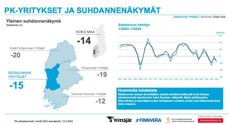 Satakunnassa pk-yritysten suhdannenäkymät ovat laskeneet selvästi syksystä 2023, jolloin ne olivat vielä positiiviset (1) ja koko maahan verrattuna verrattain korkeat. Nyt keväällä suhdannenäkymiä kuvaava saldoluku oli Satakunnassa -15, mikä on hyvin vastaava kuin koko maassa keskimäärin -14 (syksy 2023 -6). Vuoden takaisiin lukuihin ei olla kuitenkaan Satakunnassa valuttu, sillä keväällä 2023 saldoluku oli jopa -26.
