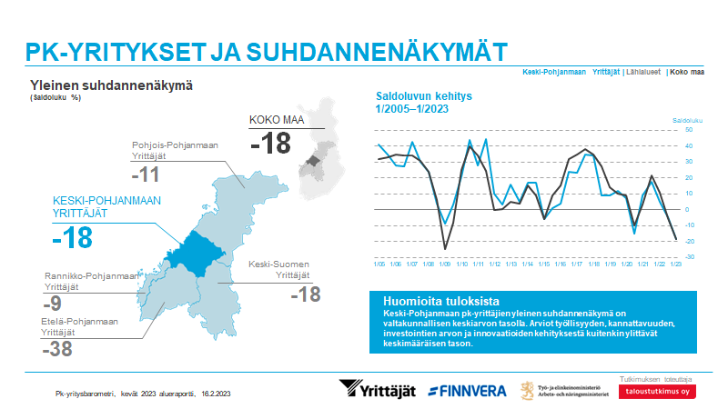 Suomen Yrittäjät, Finnvera Oyj sekä Työ- ja Elinkeinoministeriö tekevät yhteistyössä pienten ja keskisuurten yritysten toimintaa ja taloudellista toimintaympäristöä kuvaavan Pk-yritysbarometrin kaksi kertaa vuodessa. Kyselyyn vastasi yhteensä 4650 yrityksen edustajaa, joista 142 vastausta Keski-Pohjanmaan Yrittäjien toimialueelta. Kysely toteutettiin joulukuu 2022 – tammikuu 2023, internet-, sähköposti ja puhelinkyselynä. Tutkimuksen toteutti Taloustutkimus Oy.