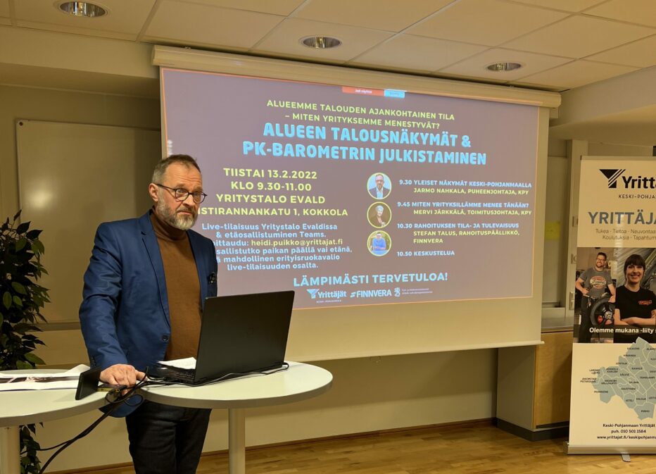- Keski-Pohjanmaan Yrittäjien alueen pk-yrittäjien yleiset suhdannenäkymät ovat nyt hiukan heikommat kuin koko maassa eli -15%, kun koko maassa ne ovat -14 %. Syksyllä suhdanneodotusten suhdeluku oli alueella -7 %, ja koko maassa -6, toteaa Keski-Pohjanmaan Yrittäjien puheenjohtaja Jarmo Nahkala. – Nahkala lisää, että tarvitsemme lisää yritysten kasvuhakuisuutta ja yritysten jatkajia koska eläköityminen on suorastaan uhka suuren ikäluokkien jäädessä eläkkeelle. – Jo korkojen lasku saisi investonnit elpymään sillä olisi vaikutusta koko yrityskenttään, toteaa Nahkala