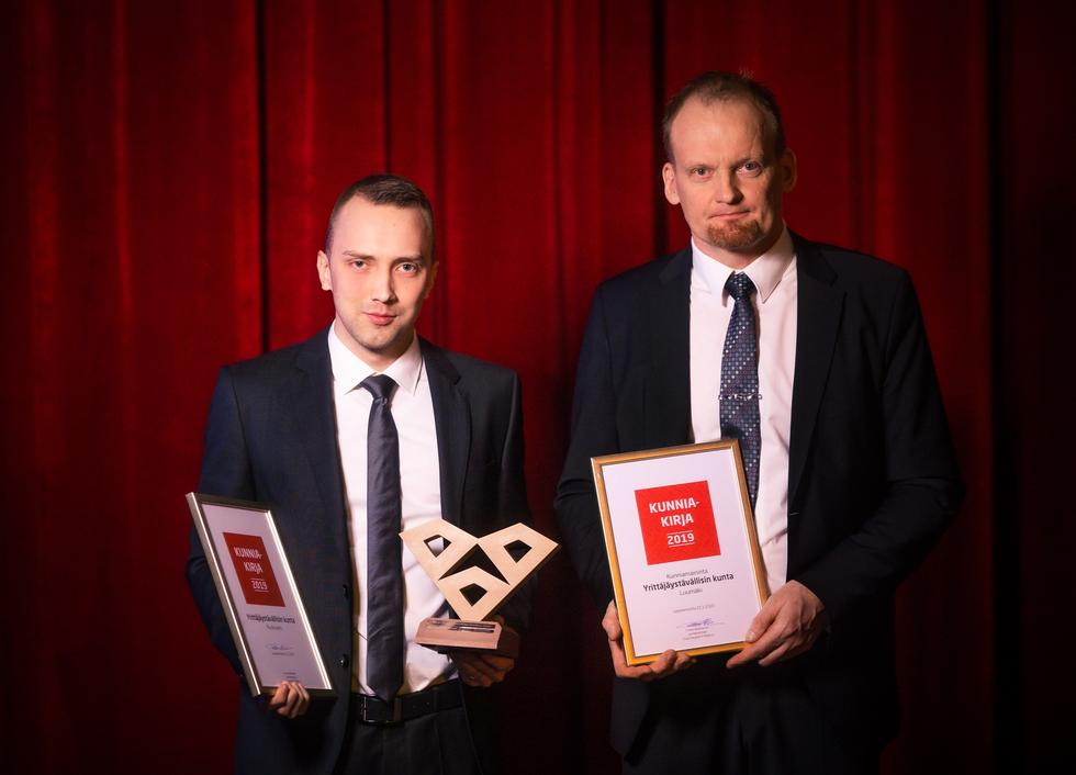 Yrittäjäystävällisimmän kunnan valintaan osallistui maakuntajohtaja Matti Viialainen yhdessä Minna Kokin ja Jami Holtarin kanssa.